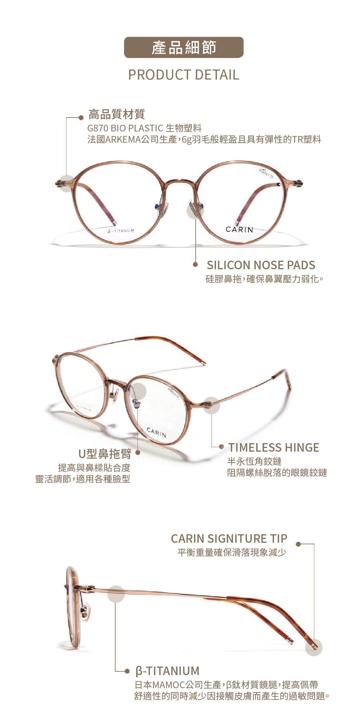 鏡框材質:G870 Bio Plastic (法國Arkema G870 高性能環保塑料) / β鈦